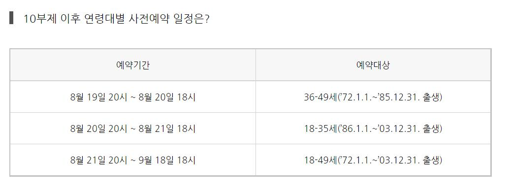 10부제를 통한 예약은 8월 9일∼18일까지 10일간 이뤄지며, 10부제 사전예약이 끝난 8월 19일∼21일까지는 연령대별로 추가 예약을 받고, 8월 22일부터 9월 17일까지는 생년월일과 관계 없이 18∼49세 누구나 예약 참여가 가능하다. 이들은 화이자나 모더나 백신을 맞게 되며 위탁의료기관이나 예방접종센터 중 본인이 접종 장소를 직접 고를 수 있다. 다만 각 지방자치단체가 우선 접종이 필요하다고 판단하는 약 200만 명은 8월 3~6일까지 사전예약을 진행한 뒤 8월 17일부터 9월 11일까지 화이자 또는 모더나 백신을 우선적으로 투약(전국 예방접종센터에서만 가능)한다.